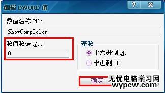 如下圖雙擊”ShowCompColor“鍵,彈出鍵值對話框,將數值數據”1“改為”0“,確定。退出注冊表編輯器,然后關閉所有程序,重啟電腦,問題就應該能夠解決了。