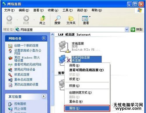 2、在彈出的“網(wǎng)路連接”窗口中右擊“無線網(wǎng)絡連接”選擇“屬性(R)”