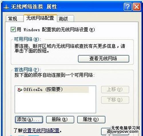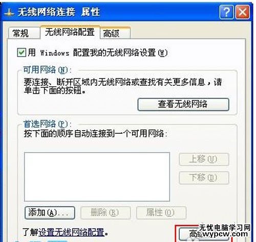 5、返回“無線網(wǎng)絡連接 屬性”窗口,選擇“無線網(wǎng)絡配置”選項然后選擇“高級(V)”