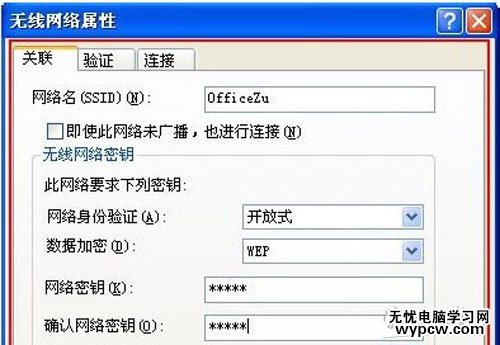 7、返回“無線網(wǎng)絡配置”在這里我們要添加一個“網(wǎng)絡名(SSID)”如:OfficeZu名字可以自己取,網(wǎng)絡密鑰最少設置5位數(shù)再勾上“這是一個計算機到計算機的(臨時)網(wǎng)絡,未使用無線訪問點”。