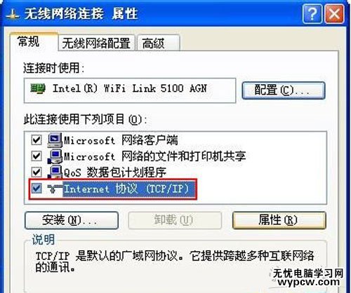 3、在“無線網(wǎng)絡連接 屬性”的窗口我們點擊打鉤“inte.net協(xié)議(TCP/IP)”然后點擊“屬性(R)”