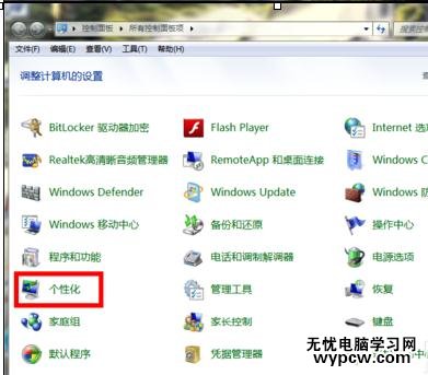 會出現彈窗顯示所有控制面板項,找到“個性化”,打開。