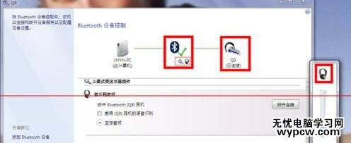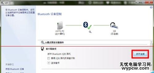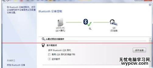 7、可以看到藍牙耳機已經和筆記本配對完成,此時可以打開音樂測試一下是否可以從耳機收聽到音樂,若無法聽到,請按照一下步驟繼續操作。打開藍牙控制面板,點擊斷開鏈接