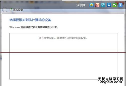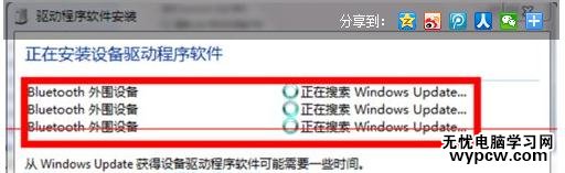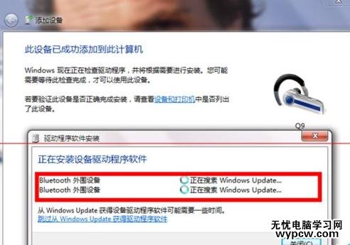 5、進入下一步后,就會發現藍牙耳機開始搜索相對應外圍驅動設備。此時很多朋友你們的電腦會出現無法搜索到相關程序設備。是由于系統藍牙驅動版本過低或者使用精簡版系統,這時需要操作的是更新筆記本電腦藍牙驅動程序。