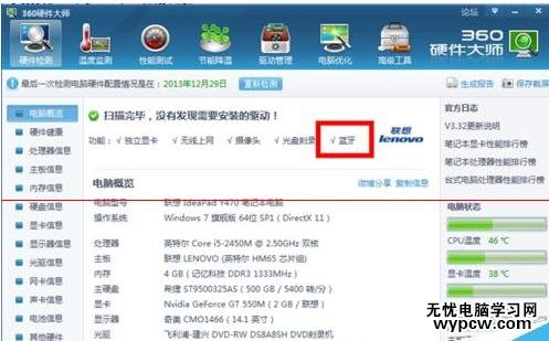 1、首先需要確認的是電腦是否支持藍牙功能,這里大家可以去設備管理器、對應電腦品牌官網、中關村或者使用第三方軟件(魯大師等)查詢一下自身電腦型號是否帶藍牙功能。