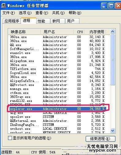 2、在進程中找到 explorer.exe 這個進程單擊一下,然后按”結(jié)束進程“按鈕,這時候桌面都沒了,不要害怕,看下一步。