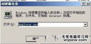 4、接下來在彈出的對話框中輸入”explorer.exe“,點擊確定,然后桌面就又回來了。