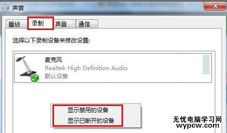 1、首先鼠標右擊任務(wù)欄上的小喇叭圖標,選擇“錄音設(shè)備”,在打開的窗口中,切換到“錄制”選項卡,然后空白處右擊選擇勾選“顯示禁用的設(shè)備”、“顯示已斷開的設(shè)備”;如圖1所示