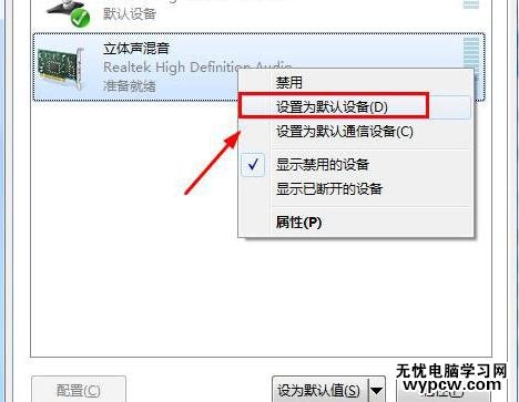 3、之后再右擊“立體聲混音”,選擇“設(shè)置為默認設(shè)備”選項,然后點擊確定按鈕退出即可實現(xiàn)內(nèi)錄了哦。如圖3所示