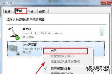 2、然后鼠標右擊“立體聲混音”,選擇“啟用”項;如圖2所示