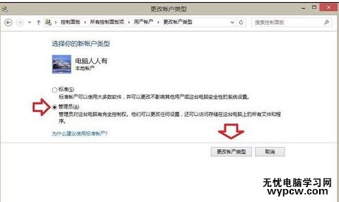 點選管理員→更改賬戶類型