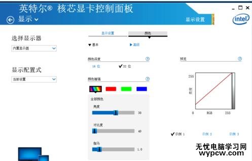 在里面會有這么一些選項,選擇顯示選項,里面顏色設置中,有一個對比度調節,如果你的屏幕很暗的話,增加一些對比度就可以,顏色不正常自己也可以摸索著調一下