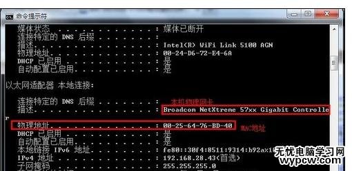 接下來找到自己的物理網(wǎng)卡,在網(wǎng)卡的下面即是網(wǎng)卡的物理地址,如下圖所示