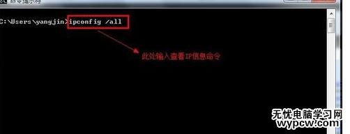 接下來在彈出的命令提示符窗口中輸入“ipconfig /all”并按鍵盤上的回車,(注:ipconfig 命令為查看IP配置信息,參數(shù)“all”表示查看所有網(wǎng)卡的全部配置信息)如下圖所示