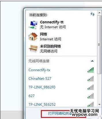 接下來在彈出的網(wǎng)絡(luò)信息顯示窗口中,點(diǎn)擊“打開網(wǎng)絡(luò)和共享中心”,如下圖所示