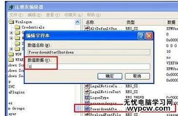 在右邊窗口找到并雙擊打開數值名稱“PowerdownAfterShutdown”的字符串鍵值,將數值數據修改為“1”,設置完成戶單擊“確定”按鈕即可生效