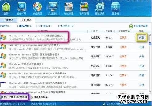 一:如果點擊刷新網(wǎng)絡(luò)列表時出現(xiàn)“windows無法配置此連接”的提示,則打開金山衛(wèi)士的“系統(tǒng)優(yōu)化”功能,點擊“開機加速”選項卡,點擊“服務(wù)項”,選中左下角的“顯示已禁止啟動的項目”,然后在列表中找到“Wireless Zero Configuration(無線配置服務(wù))”,點擊右側(cè)的“開啟”即可。然后在開始-運行中,輸?a target="_blank" class="infotextkey">.net start wzcsvc,回車即可。筆記本無線網(wǎng)絡(luò)連接不上的癥狀即可解決。