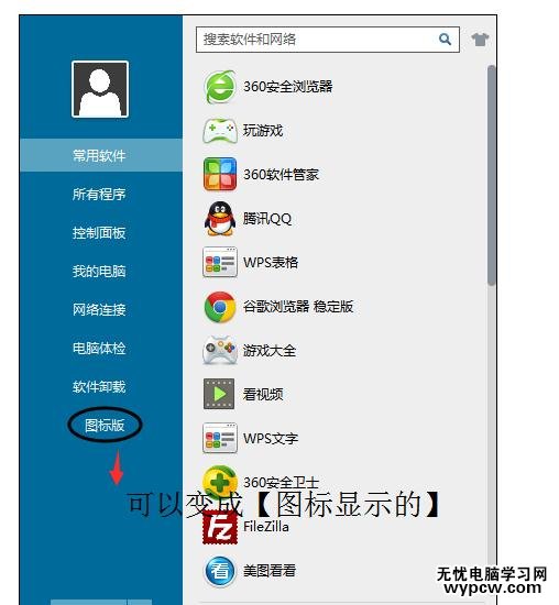 當然你也可以讓你的【開始菜單】換個模樣,點擊【圖標版】。