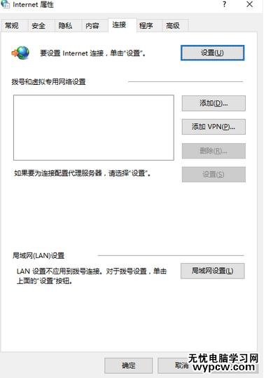 進入internet屬性,在連接一欄里點擊設(shè)置,如圖:
