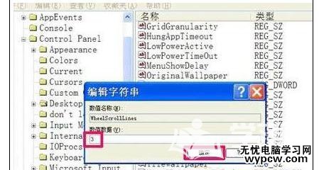 3、在右側雙擊打開【WheelScrollLines】項,將其數值數據修改為“3”點擊確定保存;