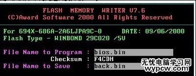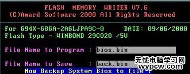 8、刷新程序提示是否要備份主板的Bios文件,為了安全起見,一定要把目前系統的Bios內容備份到機器上并記住它的文件名,在此將Bios備份文件命名為BACK.BIN,以便在更新Bios的過程中發生錯誤時,可以重新寫回原來的Bios數據;