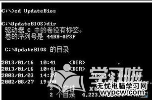 5、在命令提示符狀態下,鍵入如圖所示命令將當前目錄切換止“c:/UpdateBios”下;