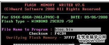 12、當進度條達到100%時,刷新過程就完成了,刷新程序提示你敲“F1”重啟動或敲“F10”退出刷新程序。一般是選擇重開機,按F10鍵進入 Bios設置,進入”BIOS Features Setup“,將“Virus Warning”(病毒警告)設置為“Enable”。最后再次重啟電腦,至此,便完成了Bios的升級工作。