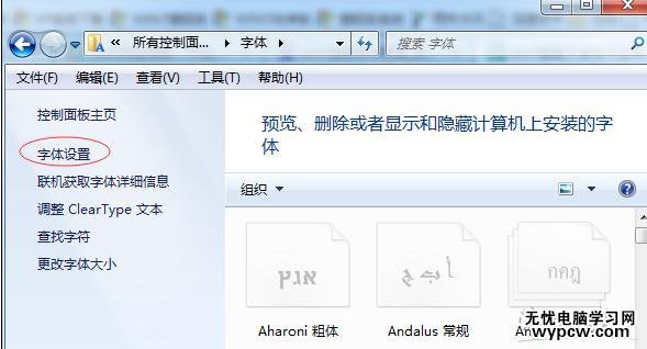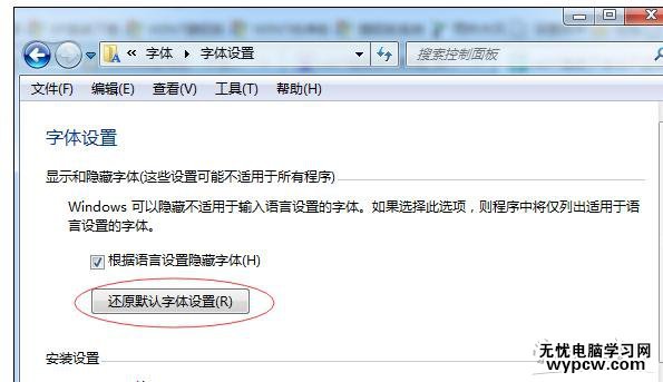 4、在字體設置的窗口里面,我們在窗口的中部有一個叫“還原默認字體設置”的按鈕,我們點擊之后在彈出的窗口中選擇確定,那么win7系統字體修復字體異常問題就可以了。