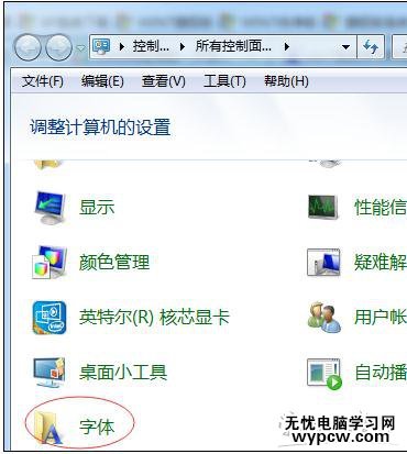 2、在win7系統的控制面板里面我們選擇“大圖標”的方式查看所有的圖標列表,這時候我們會看到有一個圖標叫“字體”,雙擊打開進行設置。