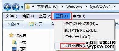 1、首先打開計算機圖標,依次展開C:/windows/SysWOW64,然后點擊工具,選擇文件夾選項,如圖所示: