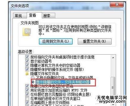 2、調(diào)出文件夾選項窗口后,在高級設(shè)置的隱藏文件和文件夾中,選擇顯示隱藏的文件、文件夾和驅(qū)動器,如圖所示: