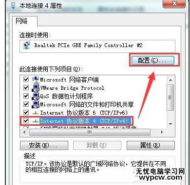 2、接著選中IPv4協(xié)議,然后點(diǎn)擊“配置”打開網(wǎng)卡屬性設(shè)置,如圖所示: