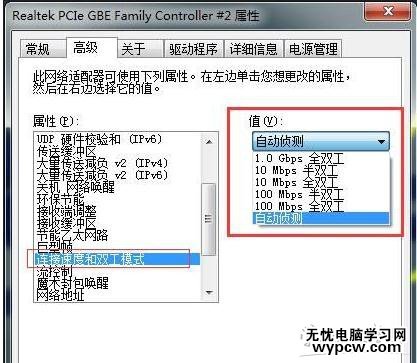 3、調(diào)出網(wǎng)卡屬性窗口后,切換至高級選項(xiàng)卡,選中“連接速度和雙工模式”,選擇100Mbps全雙工或者1Gbps全雙工模式就可以讓網(wǎng)卡全速運(yùn)行,從而解決win7網(wǎng)速慢的問題,如圖所示: