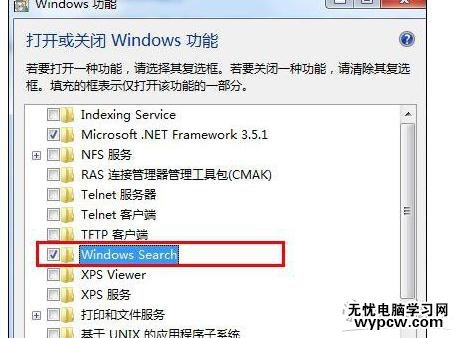 4、在彈出的Windows功能窗口中,我們找到“Windows Search”,將其勾選上,然后點擊“確定”按鈕即可,如下圖所示: