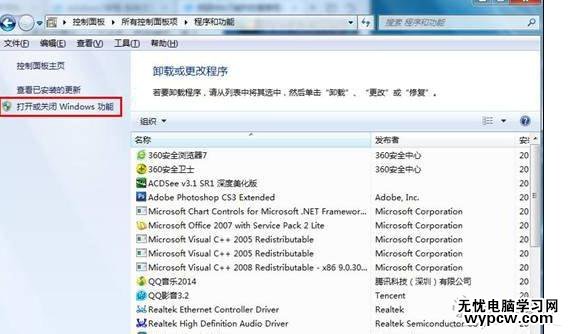 3、打開程序和功能選項窗口后,點擊它左上角的“打開或關閉Windows功能”,如下圖所示: