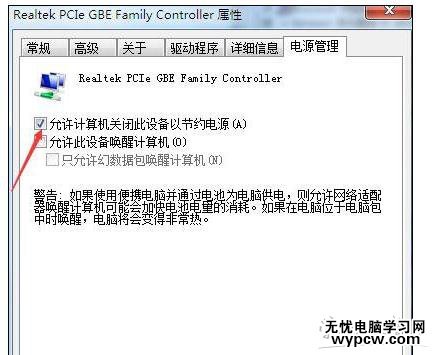 5、接著在彈出的屬性窗口中,切換選項卡到電源管理選項下,勾選“允許計算機關閉此設備以節約電源(A)”,并把“允許此設備喚醒計算機(O)”的勾選去掉,點擊確定按鈕即可。如圖: