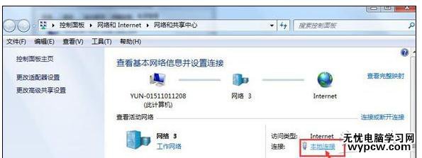 2、在網絡和共享中心界面中點擊本地連接選項,如圖: