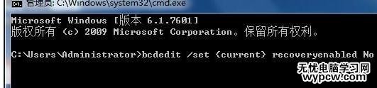 2、在命令提示符窗口中,輸入bcdedit /set {current} recoveryenabled No并按回車執行即可關閉win7系統下啟動時總顯示windows錯誤啟動修復頁面,如圖所示: