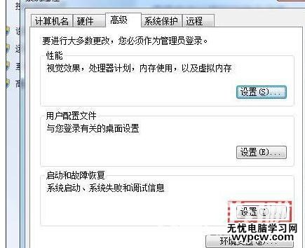 2、隨后在系統屬性窗口中,高級選項卡的啟動和故障恢復欄下點擊設置按鈕,如圖所示: