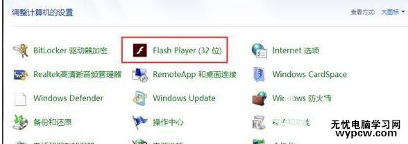 2、調出控制面板窗口后,以大圖標查看方式找到flash player(32位)并將其打開,如圖所示: