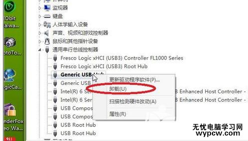 3、可是我怎么能記住那名字呢?還是用我的土辦法,挨個實驗,逐個卸載,哪一個卸載之后,鼠標底板的紅燈滅了,那個就是對應的USB接口了。