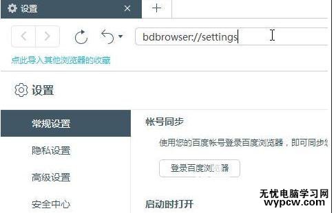 1、在“百度瀏覽器”地址欄中輸入:bdbrowser://settings 按下回車鍵打開“設置”界面;