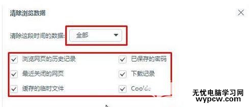 3、在“清除瀏覽器數據”界面將“清除這段時間的數據:”下拉菜單中選擇“全部”,勾選下面所有的選項,點擊“立即清除”,然后耐心等待瀏覽器清理垃圾文件。