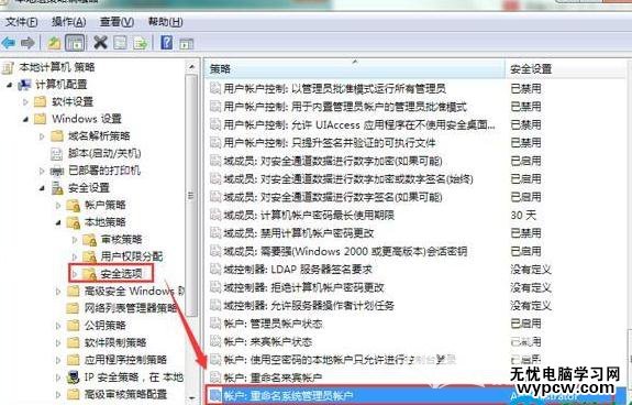 2、調(diào)出本地組策略編輯器窗口后,依次展開計算機配置→windows設(shè)置→安全設(shè)置→本地策略→安全選項,接著在右側(cè)找到“帳戶:重命名系統(tǒng)管理員帳戶”并雙擊將其打開,如圖所示: