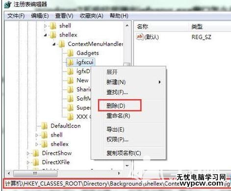 ContextMenuHandlers/igfxcui,然后刪除igfxcui項,如圖所示:
