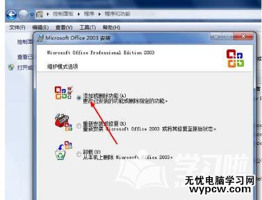 4.選擇之后,會自動出現office的修復程序,如圖所示,這里提供了兩個修復選項,一個是添加或者刪除,另一個是重新安裝或者修復。如果你的excel只是一個快捷方式,卻打不開,很可能是當初安裝的時候只預留了一個快捷方式,所以,可以選擇第一項,如果是以前安裝了打不開,要選擇第二項修復。