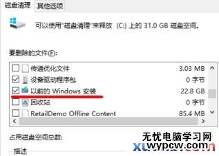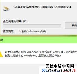 然后彈出“C 盤的磁盤清理”窗口,我們在“要刪除的文件”列表中滾動、選中“以前的 Windows 安裝”,點擊“確定”。