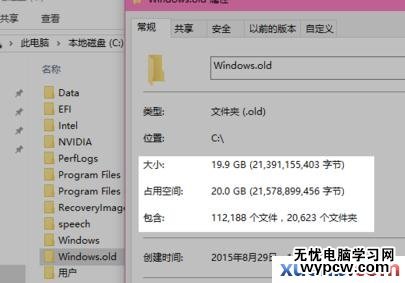 我們在 Windows.old 文件夾上右鍵-->屬性,會彈出文件夾屬性對話框并計算文件夾所占磁盤空間的大小。看看,的確不小吧,20 個 G。