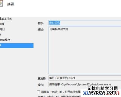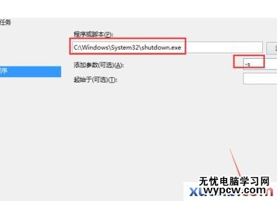 點擊程序或腳步后面的瀏覽進行選擇執行的程序,你要是知道就可以直接填寫程序,填上shutdown命令,這里參數設置-s表示關機。如下圖所示。