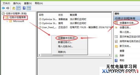 先點擊下任務計劃程序庫,然后在中間的空白位置點擊右鍵,選擇創建基本任務,也可以點擊右邊的創建基本任務,如下圖所示。